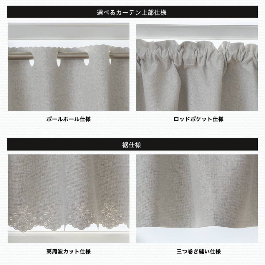 上部…ポールホール仕上げorロッドポケット(袋縫い)仕上げ 下部…高周波カット(スーパーウエーブカット)or 裾3つ巻き縫い |