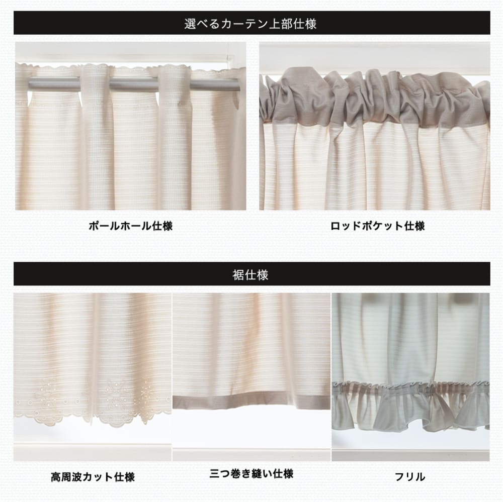 上部…ロッドポケット(袋縫い)仕上げor ポールホール 下部…裾3つ巻き縫いor 裾フリルor 高周波カット |