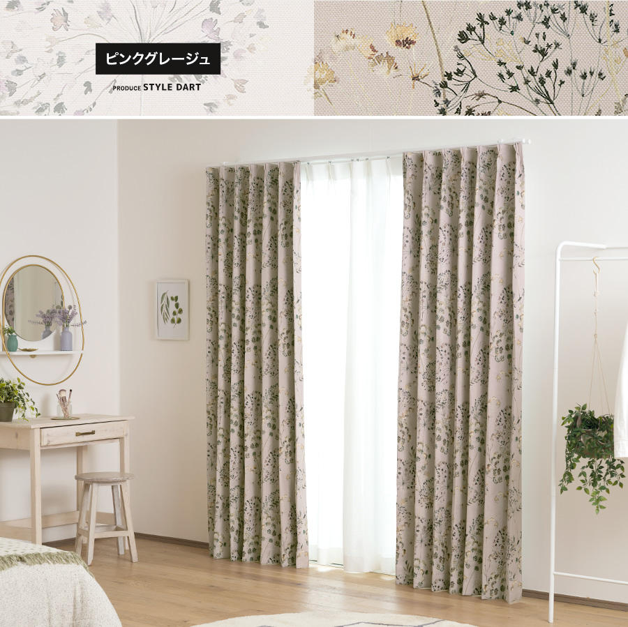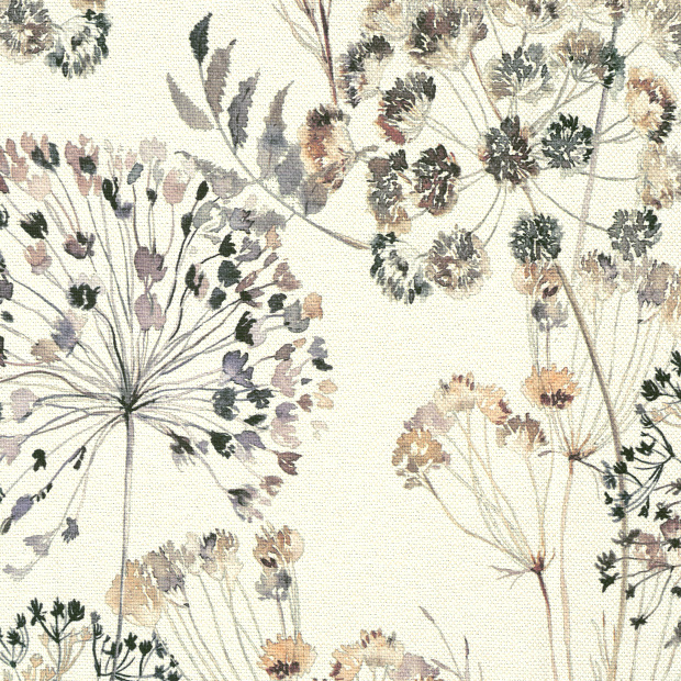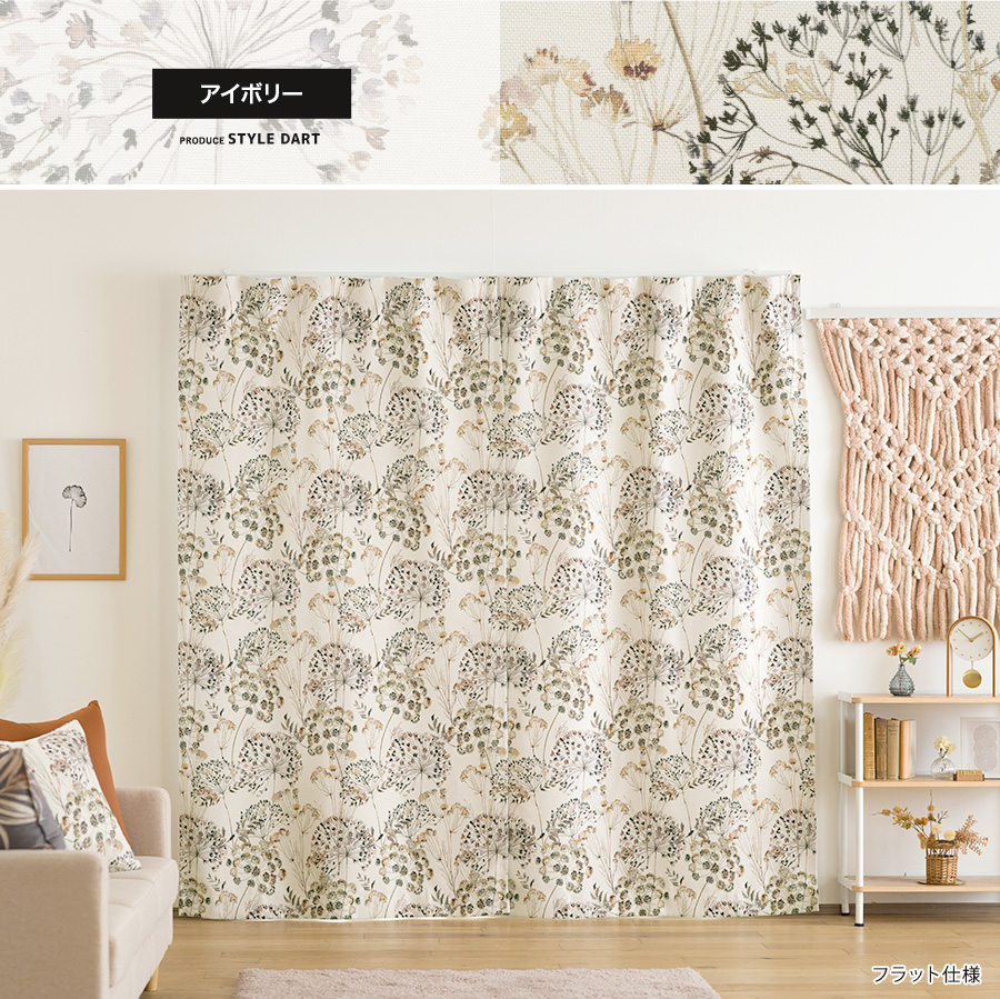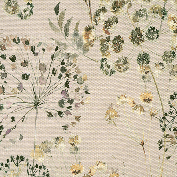 初夏に咲くホワイトレースフラワー、オルレアなど放射状に花開くセリ科の花々を水彩画風に描いたデザイン。遮光カーテンには珍しい、リネン調のやや太い糸の平織生地が表面に使われており、ナチュラルな花柄デザインにぴったり。『昇華プリント』という最新の技術で、環境に優しくヨーロッパでは多く使われています。