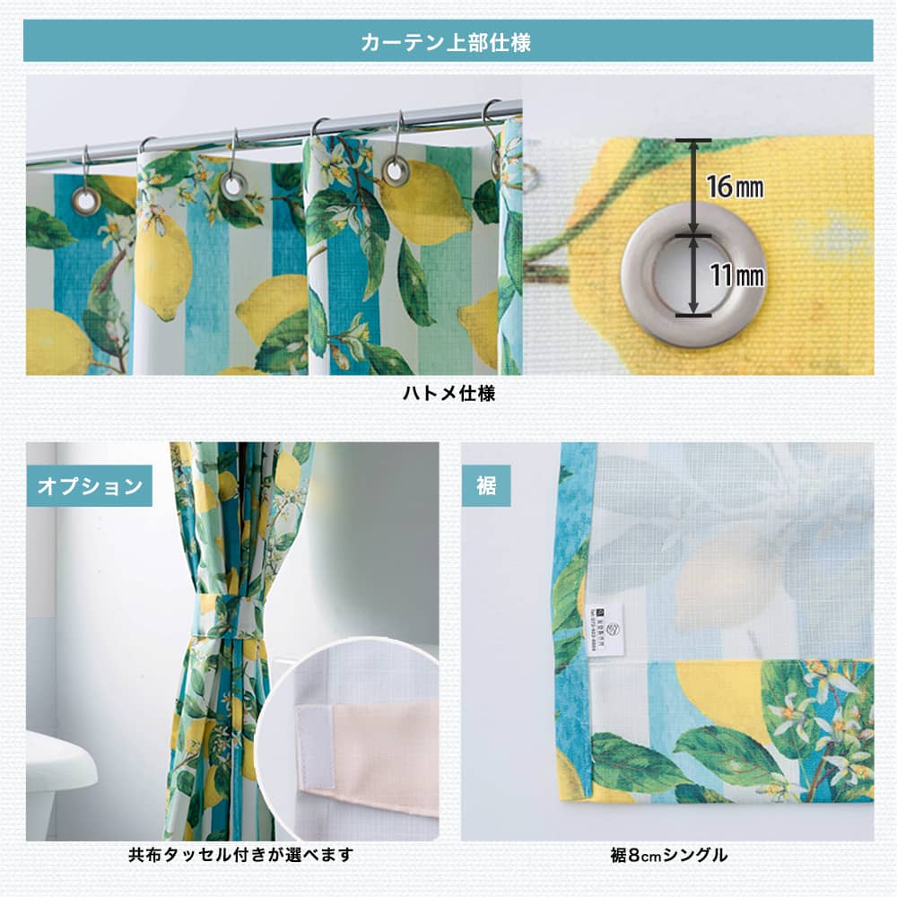 | 仕様 | 上部:ハトメ(約15cm間隔)/ 裾:8cmシングル |